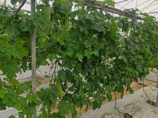 长势健壮;绿色油瓜,全条瘤果长约29.5cm,果宽约6.9cm,果肉厚约1.3cm;单果重约585克。