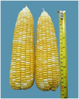 双色超甜玉米单交种,春植生育期77-82天,株高210-220cm,穗位约77-85cm,穗长19.5-21cm、穗粗5.5cm,穗行数16-18行居多,有小剑叶或无剑叶,株型半紧凑。籽粒黄白相间、光泽度好、单穗鲜重约450-500g,果穗筒形,粒行整齐、穗型美观、产量高、品质优良。抗大小斑病,鲜苞亩产达1100-1200Kg