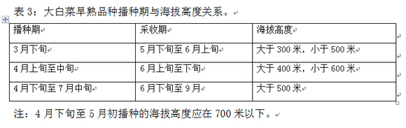 为了使大白菜在高山夏季反季节蔬菜生产中,既可避开前期低温易引起春化现象,又可使结球期处于不太高温度,提高产量和质量,根据生产实际情况,列出大白菜早熟品种播种期与相应海拔高度如下,见表3。