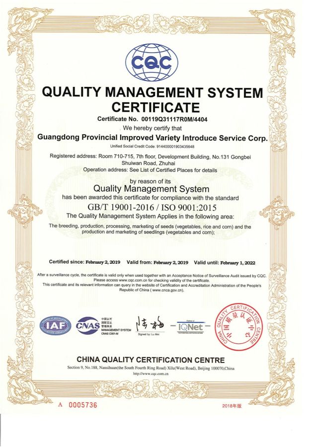 ISO9001质量管理体系认证的通过,一方面证明了公司自身的实力,另一方面是对于公司未来成长壮大的一种鞭策。我公司将在今后的工作中一如既往的严格执行质量管理体系及规章制度,进一步优化和规范各项管理制度,不断提高体系运行的有效性,不断进行积极探索,努力使企业管理体系工作上升到新高度,为实现全面的科学管理奠定了基础。为种子行业提供高质量的产品和服务!