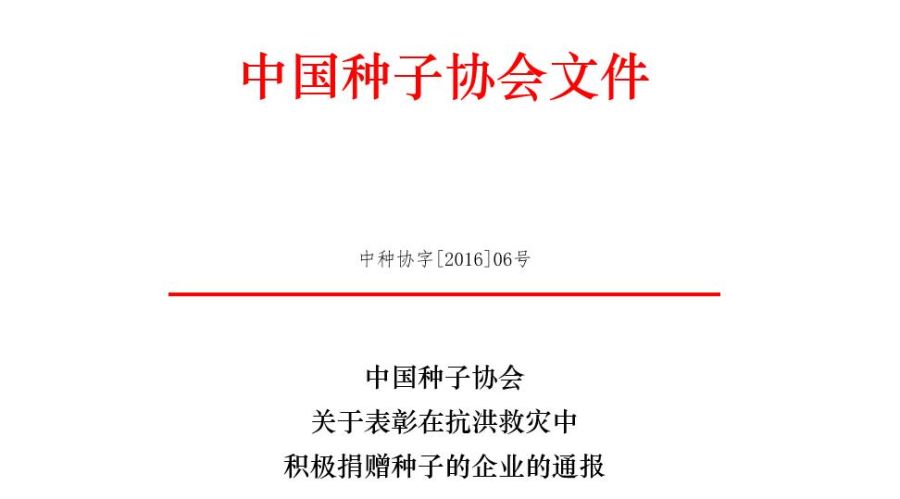 各会员单位:2016年 6月以来,我国多地相继遭遇暴雨灾害,给部分地区农业生产造成严重损失。为帮助灾区农民减轻灾害损失,及时补种相应作物,7月7日我会向会员企业发出倡议书,号召广大种子企业紧急行动起来,支援救灾种子,帮助灾区恢复农业生产。截止7月底,共收到28家种子企业无偿认捐的23个种类的蔬菜种子和水稻玉米种子...